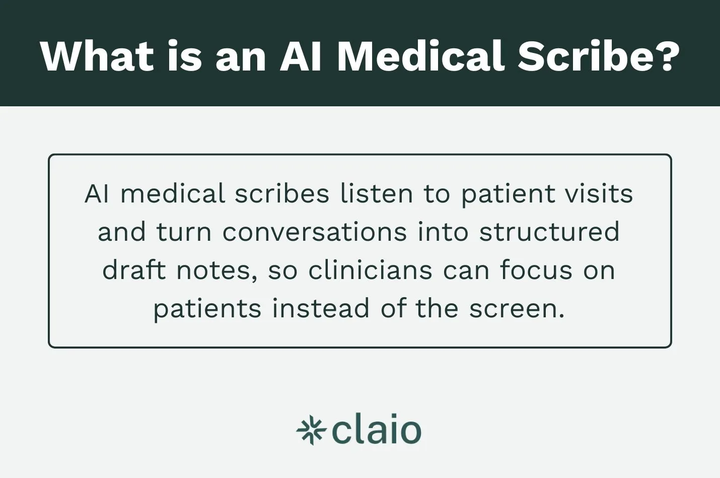 An AI medical scribe is a tool that helps clinicians document patient visits by automatically generating draft notes from the conversation. Instead of typing during appointments or dictating notes afterward, clinicians can focus on the encounter while the scribe captures and structures the information in the background.