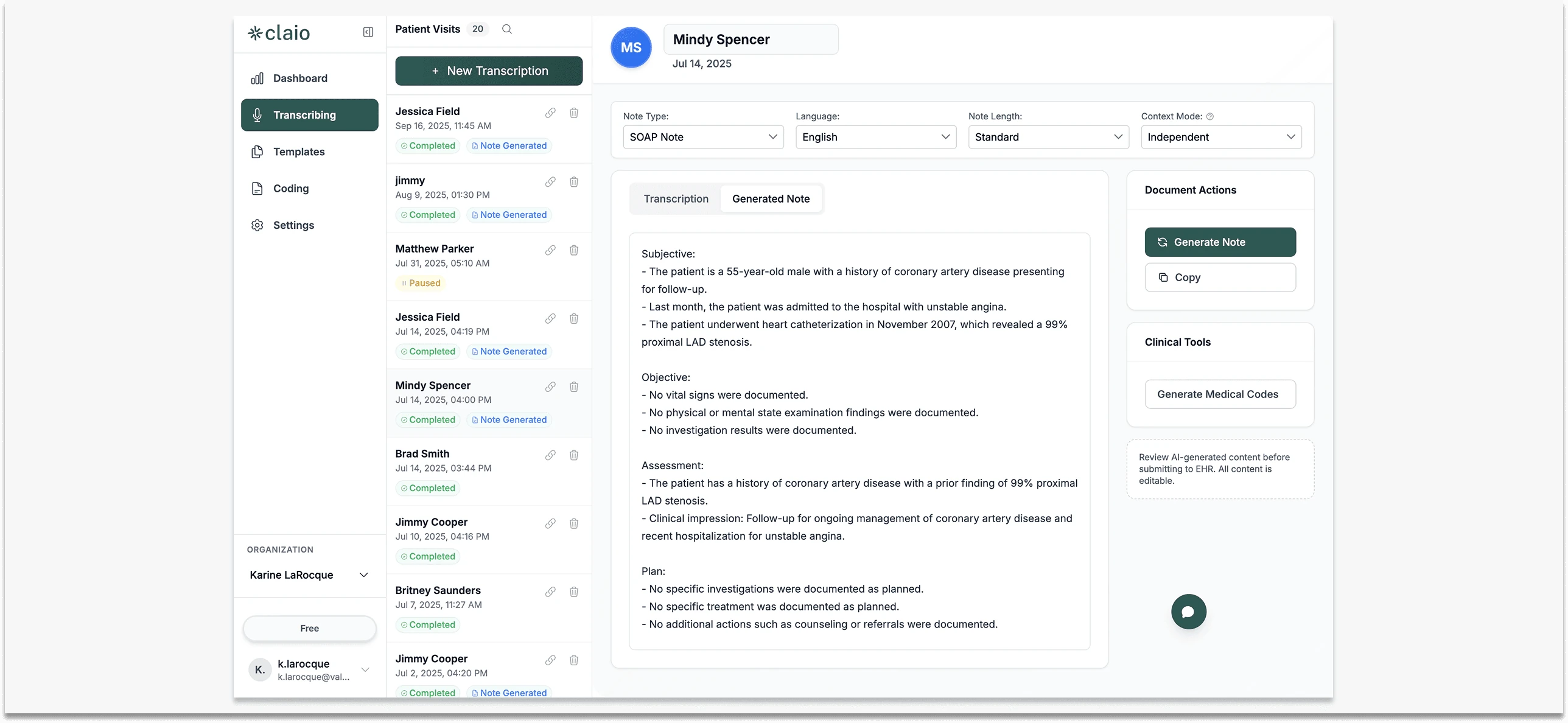 How to use it: When finalizing a note, open the Coding panel. Claio now displays CPT codes with modifiers and confidence suggestions.