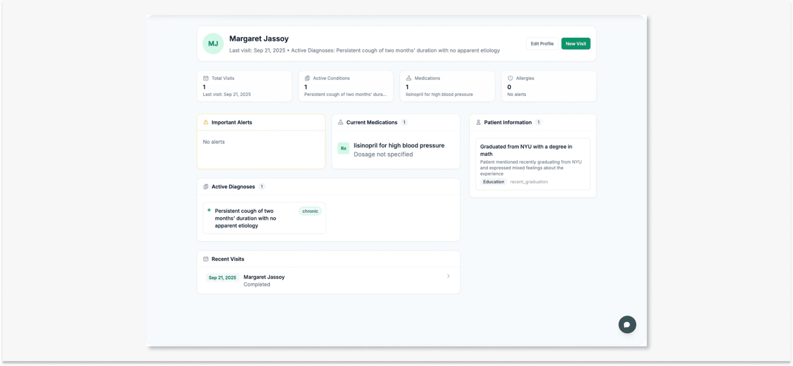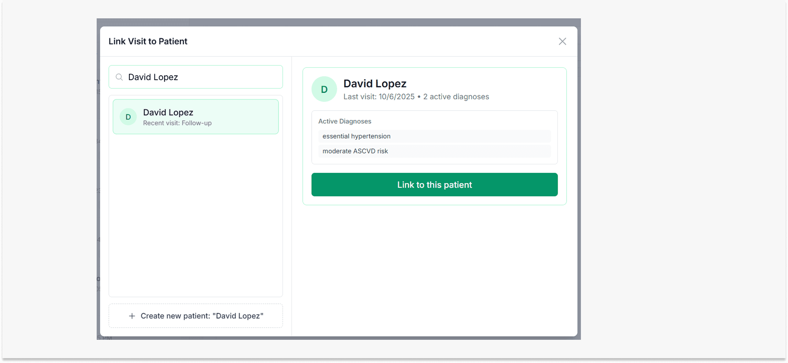 Patient details used to live across multiple notes. Now they’re organized in a single, dedicated page: diagnoses, medications, visit history, and key details at a glance.