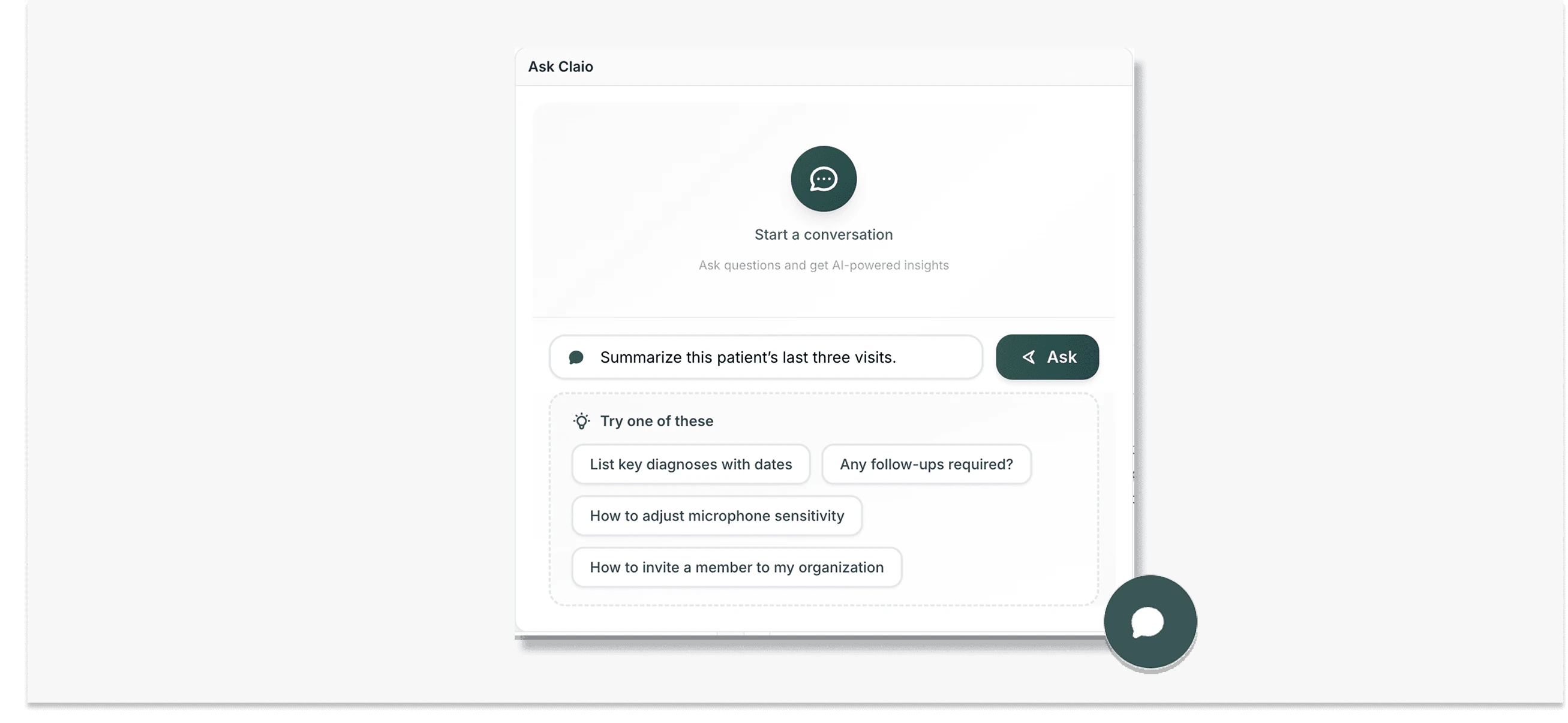 Ask setup questions like “How do I invite a new team member?” or clinical ones like “Summarize this patient’s last three visits.” You’ll get clear, step-by-step answers instantly.