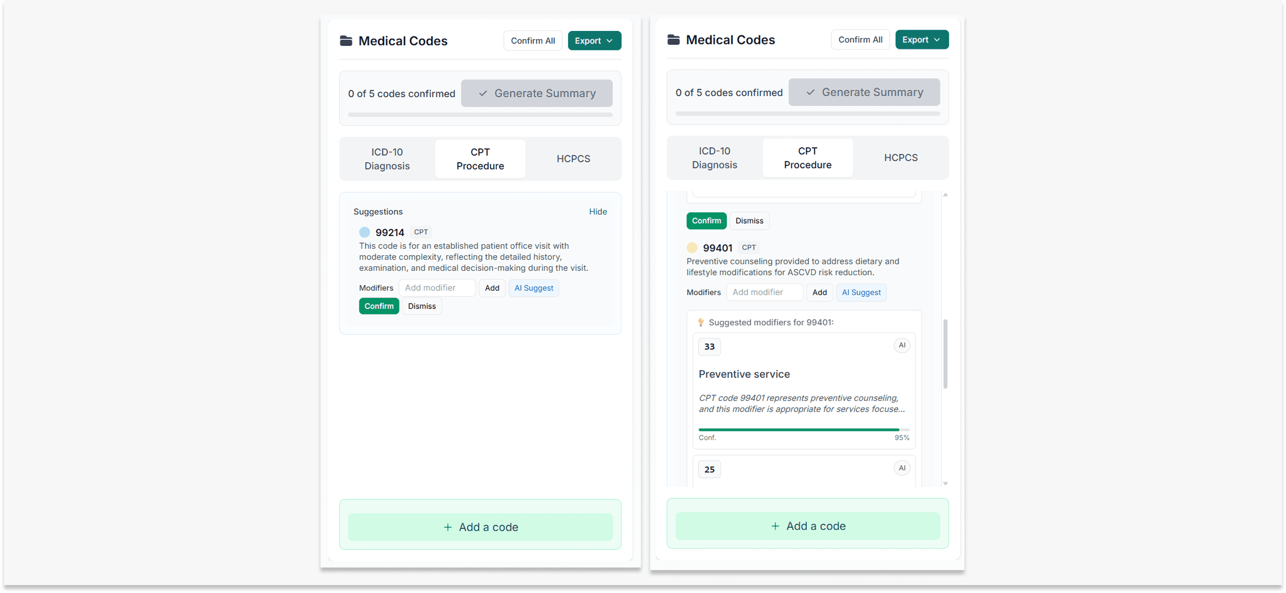 Claio now supports CPT modifier codes (like 26 for professional component, TC for technical component) and offers AI-powered suggestions with confidence scores.
